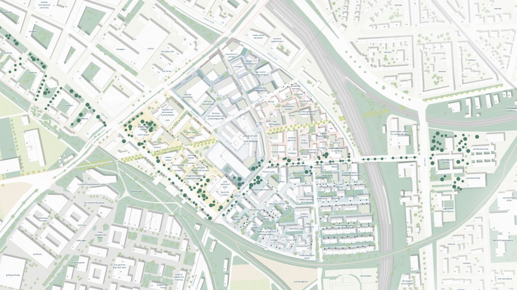 Mit den vorgeschlagenen inhaltlichen, baulichen wie klimatischen Interventionen wird eine nachhaltige Entwicklung des Gewerbegebiets gewährleistet. Eine Vielzahl an Nutzungen und aneignungsoffenen Aufenthalts- und Aktivitätsflächen fördern die Produktivität auf unterschiedlichen Ebenen im Sinne einer „produktiven Stadt“.