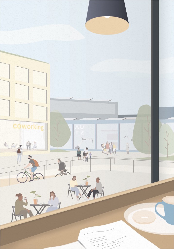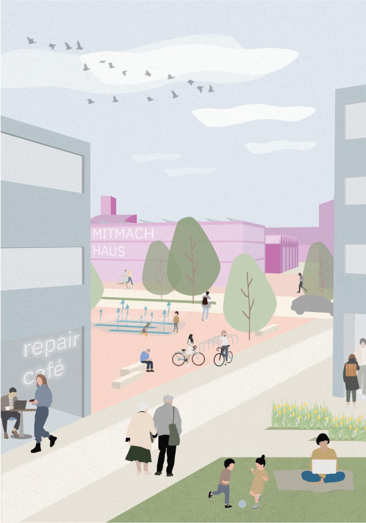 Wirtschaftliche Produktivität braucht soziale Produktivität – und so wird das Areal um die (Wohn)Fabrik ergänzt. Diese zeichnet sich durch vielfältige Grünräume, Begegnungsorte und wichtige kulturelle Einrichtungen aus, die den Fokus auf soziale Interaktion und auf die Gemeinschaft legen.