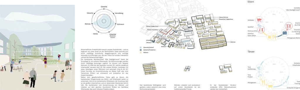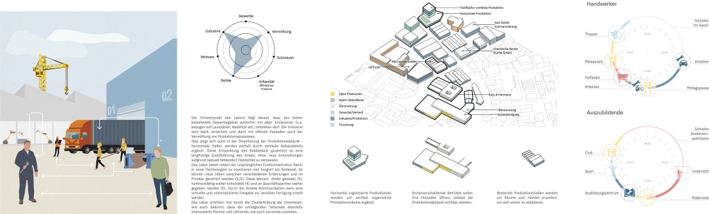 Der Schwerpunkt des Labors liegt darauf, dass das bisher bestehende Gewerbegebiet weiterhin mit allen Emissionen (u.a. bezogen auf Lautstärke, Abdampf etc.) bestehen darf. Die Industrie wird stark verdichtet und dient mit offenen Fassaden auch der Vermittlung von Produktionsprozessen.