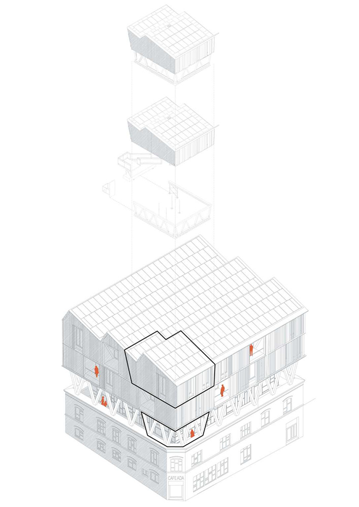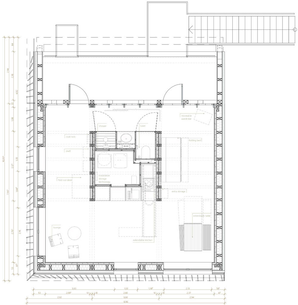 Konzipiert als vorgefertigtes Modulsystem in 100% kreislauffähiger Bauweise beweist die Einheit schon heute, dass mit aktueller Technologie und Entwurfskapazitäten die Anforderungen des European Green Deal zur Kreislaufwirtschaft im Bauwesen zu erfüllen. Es wurden keine Klebstoffe, keine Imprägnierungen oder Farben, keine Schäume oder Nassabdichtungen verwendet, so dass die Kreislauffähigkeit der Materialien zu 100% gewährleistet bleibt. Außerdem wurden für die Konstruktion nur Monomaterialien verwendet, das heißt, es sind keine Verbundstoffe oder Materialmischungen verbaut. Viele Bauteile und Materialien wurden bereits aus der städtischen Miene entnommen und im zweiten, dritten oder gar vierten Kreislauf verwendet: Holz aus alten Scheunen im Schwarzwald, die Eingangstür aus einem Gebäude aus dem 19. Jahrhundert, Fenster aus einem abgerissenen Gebäude in Basel, Bad- und Küchenarmaturen aus Messe-Rückbauten. RoofKIT enthält auch Materialien, die rekonfiguriert wurden, d.h. das Material wurde recycelt, während die Form des ehemaligen Produkts verändert wurde. RoofKIT ist schon heute ein Leuchtturm-Projekt für ein zukünftige zirkuläre Baukultur und Industrie.