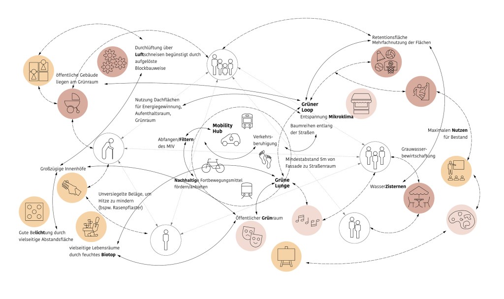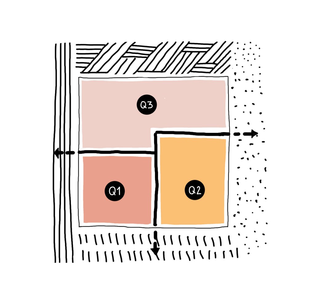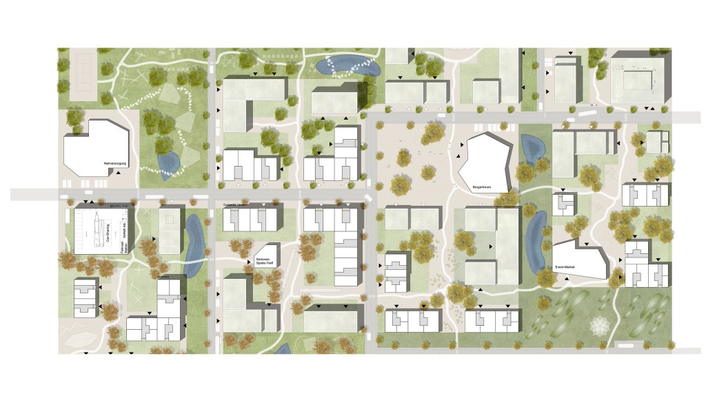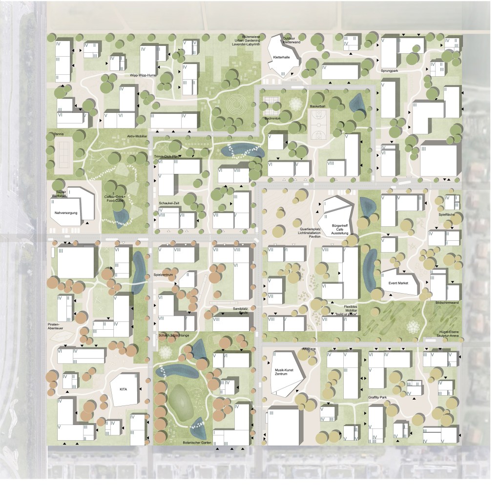 Das Ausformulieren von drei verschiedenen Teilquartieren: Q1 – LebensDORF, Q2 – KulturSTADT und Q3 – SportLAND, ermöglicht es unterschiedlichen Nutzerprofilen nachzukommen und diese auf gemeinschaftlichen Ebene zu verknüpfen. Fuß- und Fahrradrouten verbinden alle Teilquartiere miteinander und münden auf dem Quartiersplatz. Dieser ist als flexibel bespielbarer Platz der Dreh- und Angelpunkt des Quartiers. Das Verankern der Erschließung in den Grünen Loop ermöglicht eine abwechslungsreiche Durchwegung, eine soziale Durchmischung und begünstigt das Erleben des Quartiers aus der Fußgängerperspektive.