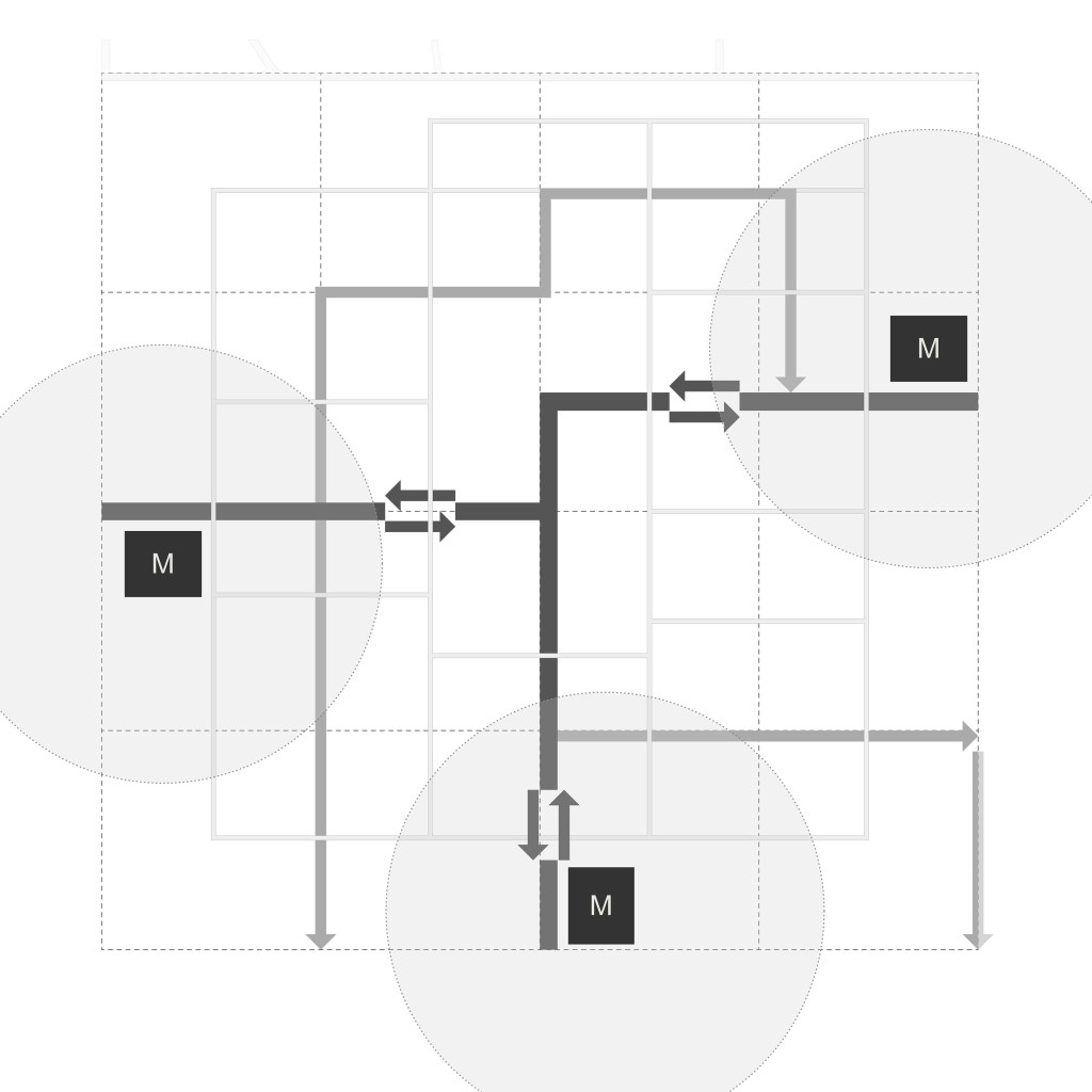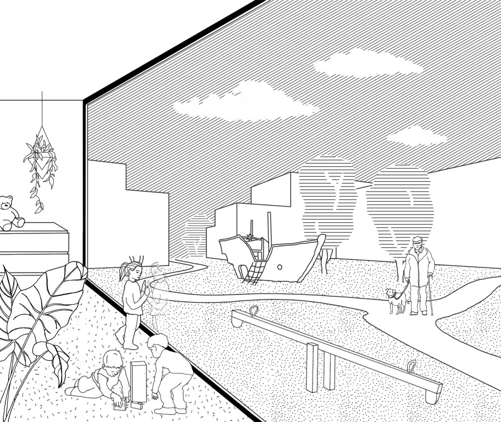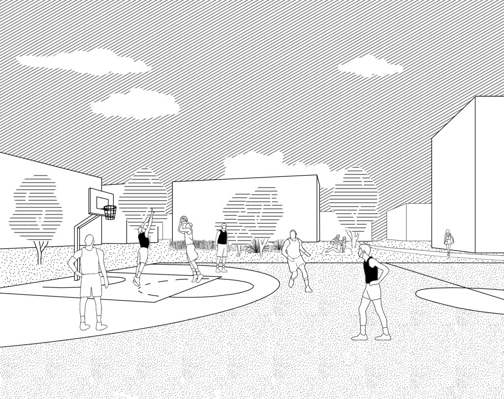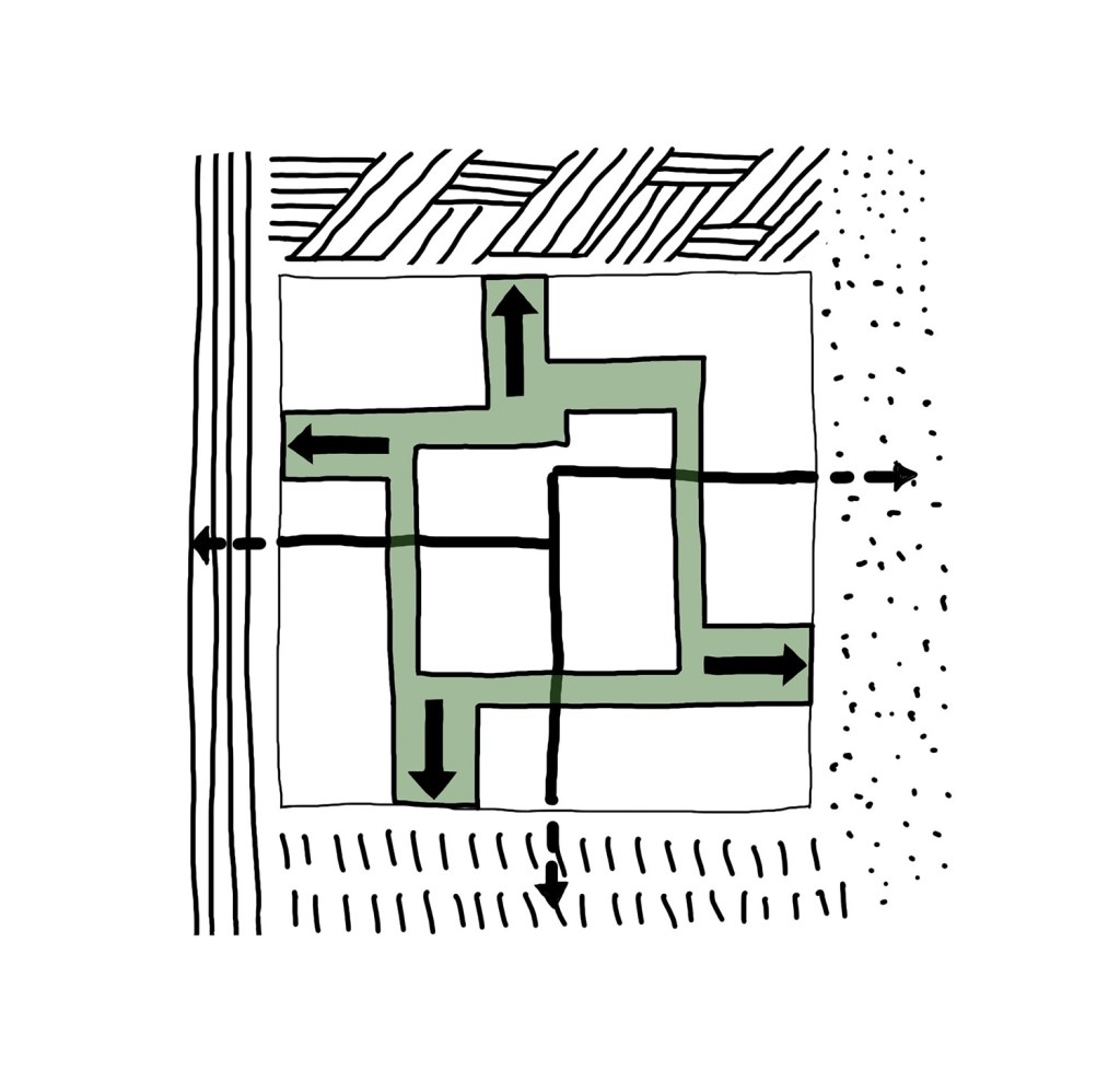 Das Ausformulieren von drei verschiedenen Teilquartieren: Q1 – LebensDORF, Q2 – KulturSTADT und Q3 – SportLAND, ermöglicht es unterschiedlichen Nutzerprofilen nachzukommen und diese auf gemeinschaftlichen Ebene zu verknüpfen. Fuß- und Fahrradrouten verbinden alle Teilquartiere miteinander und münden auf dem Quartiersplatz. Dieser ist als flexibel bespielbarer Platz der Dreh- und Angelpunkt des Quartiers. Das Verankern der Erschließung in den Grünen Loop ermöglicht eine abwechslungsreiche Durchwegung, eine soziale Durchmischung und begünstigt das Erleben des Quartiers aus der Fußgängerperspektive.